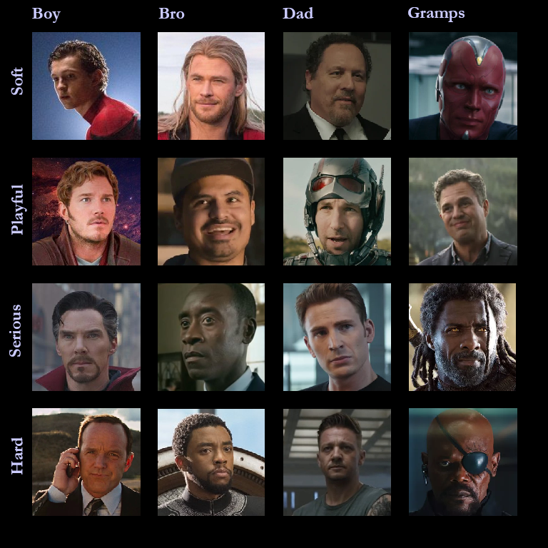 Each axis has four options, creating a sixteen-box grid (with MCU characters thrown in for flavor) as follows: